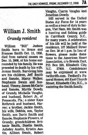 SHAWBORO - William M. “Trim” SMITHSON, JR., 81, of 105 Meads Road, Shawboro, NC, died Thursday, May 21, 2009 at Guardian Care Nursing Home, Elizabeth City, NC. He was a native of Currituck County, NC, the son of the late William M. SMITHSON, SR. and the late Rovena Rollinson SMITHSON. Mr. SMITHSON was a member of Providence Baptist Church, and a veteran of the U.S. Army, having served in WWII. He was the former owner and operator of Trim’s Upholstery. Mr. SMITHSON is survived by his daughter, Tammy ANDERSON and her husband Mitchell of Alexandria, VA; a son, Rex SAWYER and his wife Rhonda of Camden, NC; two nieces, Janet INGE, whom Mr. SMITHSON looked upon as both a mother and a daughter, and her husband Bill of South Mills, NC, and Darlene SMITHSON of Virginia; and two nephews, Larry SANDERLIN and wife Clara of Camden, NC, and Earl SMITHSON, JR. and wife Linda of Virginia. He was preceded in death by a sister, Zelma SANDERLIN; and a brother, Earl SMITHSON. A funeral service will be held Sunday, May 24, 2009 at 2:00 p.m. at Twiford’s Memorial Chapel with Rev. Boyce PORTER officiating. The family will receive friends immediately following the service in the lobby of the funeral home. Twiford Funeral Homes, Memorial Chapel, 405 East Church Street, Elizabeth City, NC is assisting the Smithson family. (Twiford Funeral Home)
