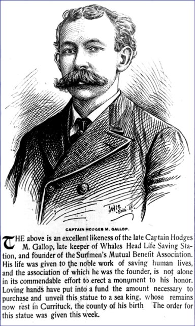 SURFMEN MUTUAL BENEFIT ASSOCIATION MEET [partial of a very lengthy article] - It would never do for us to conclude this story without noting the sad loss of four members [only one named] of the above association during the past year. The most mourned of those gathered to their father's is the late Hodges M. GALLOP. Mr. GALLOP was a man that was but to be known to be admired. His friends were numberless and his enemies were not known. He entered the service nearly 12 years ago. Three years ago he was appointed keeper of Whales Head Life Saving Station. At about this time he had perfected the organization of the Surfmen's Mutual Benefit Association of which he was elected president, filling the position until May 7th, 1902 when he departed this life at his home in Corolla. Hodges M. GALLOP was only 35 years of age at the sad termination of his earthly career. His every effort had been for the promotion of the best interests of his fellow man. During his 12 years in the life saving service he accomplished much for his brother surfmen and gained their undying praise and admiration.