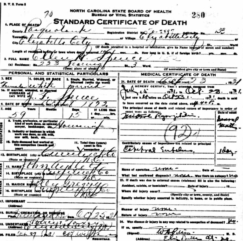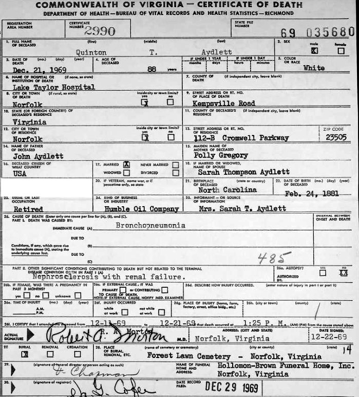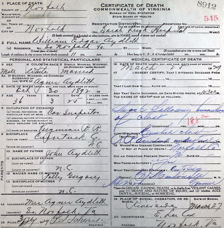 8) William Edgar "Willie" Aydlett - b. Oct. 30,1892 - d. Mar. 25, 1929 [see death certificate]; married Agnes ODell Sawyer Dec. 28, 1913 in Pasquotank Co., NC; buried in Riverside Memorial Park Cemetery, Norfolk, VA. [At the age of 76 Agnes married Howard Busby Jones, also age 76, in Norfolk on Apr. 16, 1969.]