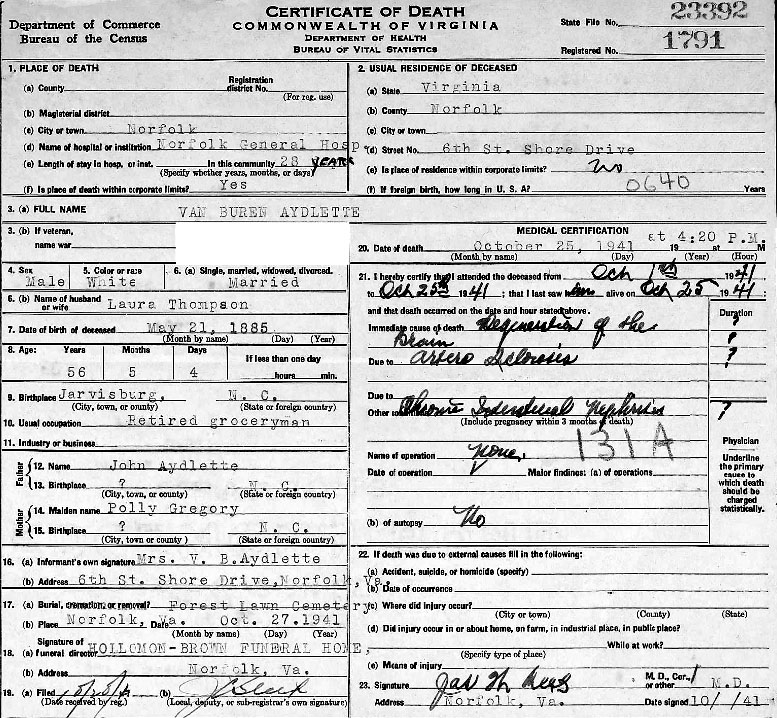 6) Van Buren Aydlett - b. May 21, 1886 [death certificate states 1885] - d. Oct. 25, 1941 Norfolk, VA; married Laura Frances Thompson on Jan. 21, 1906; buried in Forest Lawn Cemetery in Norfolk, VA.