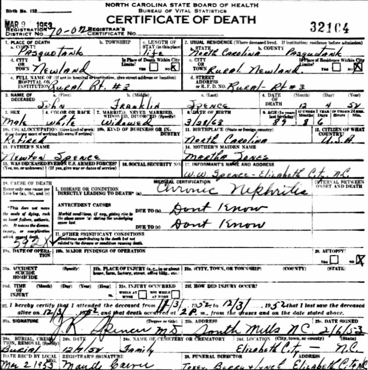 John Aydlett, son of John Aydlett (1822-1870) and Allie Brock (1824-1887), was born Aug. 30, 1849 and died on Aug. 1, 1906 [see his estate record]. He married Mary "Polly" Gregory in Currituck Co. on Jan. 28, 1872. Polly, the daughter of Hiram Gregory (1827-1908) and Julia Bean (1831-1895), was born Oct. 17, 1853 and died Aug. 5, 1900. John & Polly (Gregory) Aydlett are buried in the Gregory Cemetery in Jarvisburg, NC. They had 9 known children. 1) Ellen H. Aydlett - b. Oct. 8, 1872 - d. Oct. 23, 1931 [see death certificate]; married John Franklin Spence on Nov. 8, 1888. John was born Mar. 28, 1863 and died Dec. 4, 1952 [see death certificate]. They are buried in the John Franklin Spence Family Cemetery in Pasquotank Co., NC