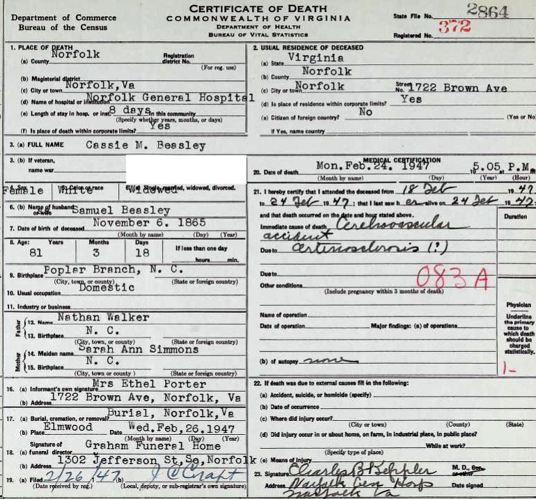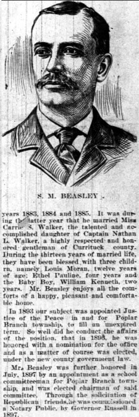 Photo circa 1890 According to his tombstone in Elmwood Cemetery in Norfolk, VA, Samuel Mordecai Beasley was born Feb. 7, 1863 & died Aug. 6, 1910 [see obituaries]. Sam was the son of Joshua Beasley & his wife Elizabeth (Bonney) Beasley. Sam married Cassie Simmons Walker in Poplar Branch, NC on Apr. 12, 1885. Cassie, born Nov. 6, 1865, was the daughter of Nathan L. Walker and Sarah Ann Simmons. At age 81 Cassie died in Norfolk on Feb. 24, 1947 [see death certificate & obituary] and is buried beside her husband. [see the Samuel Beasley house] Sam & Cassie had three children. 2. Ethel Pauline Beasley - b. May 11, 1894 Currituck Co. d. July 28, 1975 Petersburg, VA [see death certificate & obituary]. Buried: Elmwood Cemetery, Norfolk, VA in the Beasley plot. Married: William A. Porter before Jan. 1920 likely in the Norfolk, VA area. No children. 3. William Kenneth Beasley - b. Nov. 1896 Currituck Co. Vanished: Feb. 13, 1905 Poplar Branch, NC; Kenneth was never found and presumed dead. [see Misc. News Articles - scroll down to Washington Post Sept. 8, 1906-Sept. 20, 1907] |