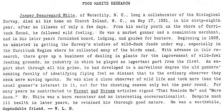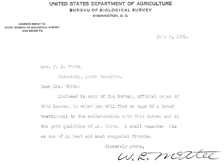 children: 1) Richard Blair White born Aug. 24, 1888; married Sallie G. Partridge 2) Ruth Virginia White born June 2, 1892 Norfolk, Va. & died Aug. 24, 1959; married James C. Brumsey, Sr. After Sarah's death in 1894 he married Sarah Josie Phaup in Currituck Co. on June 14, 1900. Jasper and Sarah (Phaup) White are buried in the Hampton Cemetery [see tombstone] in Waterlily, NC. A letter from W.L. McAtee to Mrs. J.B. White dated June 8, 1931 included his death notice. |