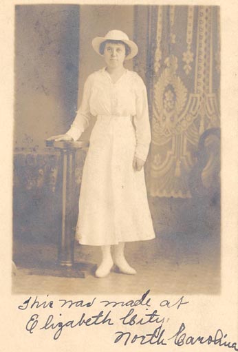 Caption on back says: To Elizabeth Brumsey from Olive Perry, May the 4th 1917. Olive Hassell Perry was born in Kitty Hawk on Nov. 17, 1895 to Charles Bailey Perry & Mary Love (Tillett) Perry. She married Frank Hayman in Manteo, Dare Co., NC on June 5, 1918. She died in Edenton, NC on Aug. 12, 1985 and is buried in Austin Cemetery in Kitty Hawk. |