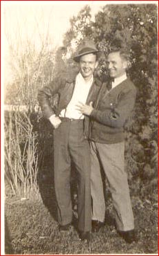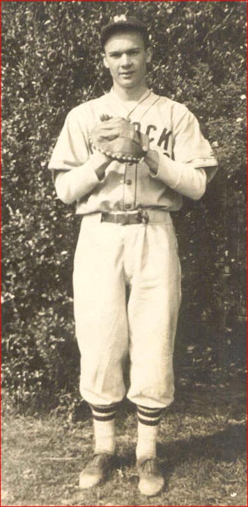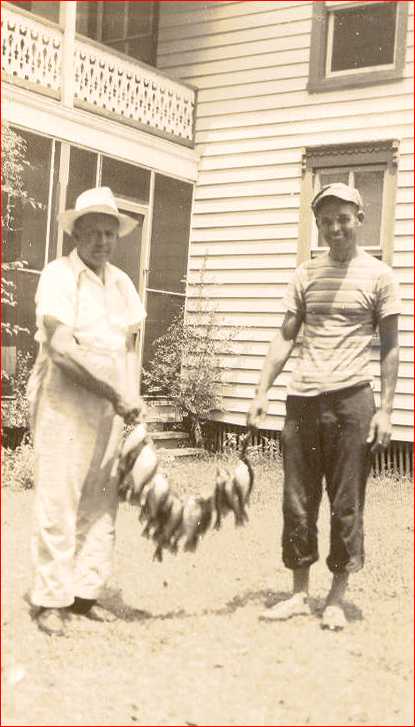 | Thomas Edward Creekmore, Jr., son of Edna Powell Creekmore and Thomas Edward Creekmore, Sr. Thomas was born at the Wilcox Farm on Pudding Ridge Rd on February 5, 1919. He is wearing his Moyock High School baseball uniform. He excelled in basketball and baseball during the mid 1930's when he attended Moyock High School. Moyock High School burned down mysteriously after a basketball game with a rival high school. It was always thought that the school's fire was no accident as Moyock had defeated the rival school. | Photo taken in back of the Creekmore House in Moyock Village in 1940. Thomas Edward Creekmore, Sr. is on the left and his fishing buddy, Willie Lee Barnes (1912-1988) is on the right. Looks like a good mess of fish! |