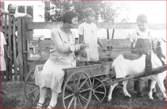 | Picture was taken approximately 1925 at the Wilcott Farm on Pudding Ridge Road. The young boy with the goat is Thomas Edward Creekmore, Jr. His father, Thomas Sr., farmed for the Wilcott's. The young girl in the picture is his sister, Mary Creekmore Elliott, who was born around 1917. The older woman in the cart and the man standing beside the gate are unidentified. |