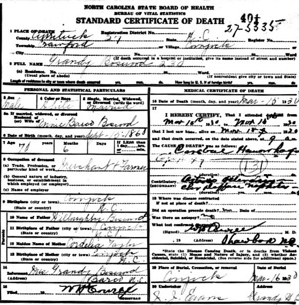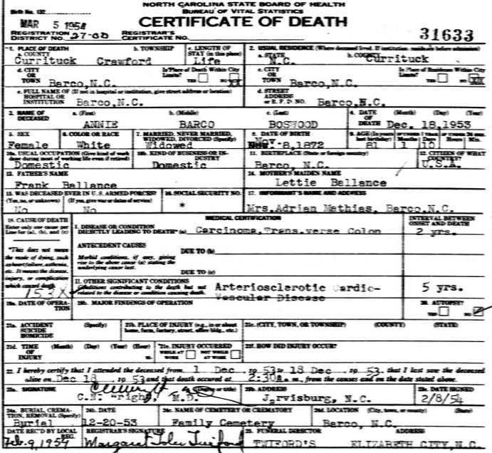 Annie Boswood Annie Barco, daughter of Benjamin Franklin "Frank" Barco & Letisha "Lettie" Ballance [see Lettie's photo] was born Nov. 8, 1872 and died Dec. 18, 1953. Annie's death certificate and obituary erroneously lists her father as Frank Ballance. Annie Barco married Grandy Boswood in Currituck Co. on Nov. 8, 1900. Grandy was born Sept. 15, 1859 and died March 14, 1930 [see his death certificate]. Grandy & Annie Boswood had one daughter named Hilda who was born July 6, 1904 and died in Georgia on July 17, 1983. Hilda married Adrian Mathias (1908-1969). The Grandy Boswood home in Barco can be seen here.