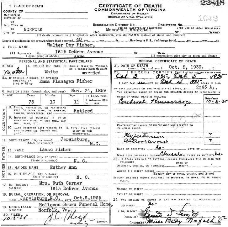 ![]() Walter Dey Fisher was born in Jarvisburg, NC on Nov. 24, 1859 to Isaac C. Fisher & Hester Ann Owens. He died in Norfolk, VA on October 5, 1935 [see death certificate] and is buried in Forest Lawn Cemetery in Norfolk. Walter married Emma C. Flanagan in 1891 and they had 3 children: Ruth Fisher (1894-1941) who married Elmer B. Carner; Robert A. Fisher (1896 - ???); and Mildred Fisher (1898-1964) who married Allen Raymond Cross. |