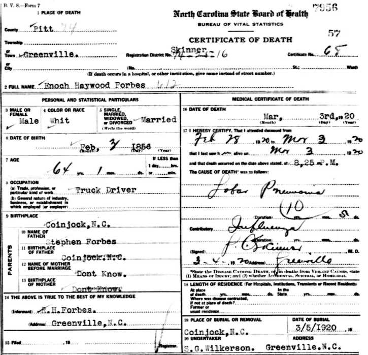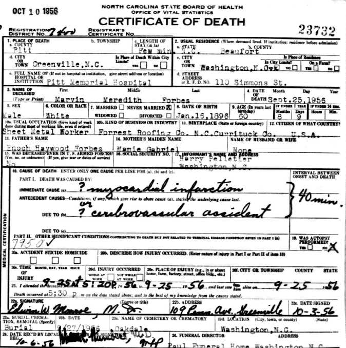 Haywood Forbes, son of Stephen G. & Ann Forbes, was born in Coinjock, NC on