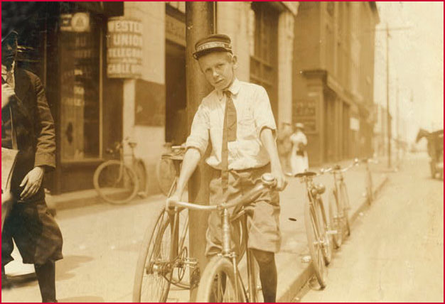 Caption: June 1911 - Hodges Gallop, Western Union Messenger No. 16, Norfolk, Va. Lives 201 Freeman Street. Been working here one month. He, and several other very young boys, work until 10:30. [Photo taken by Lewis Wickes Hines (1874-1940) in conjunction with National Child Labor Committee records. As near as I have been able to determine, this young man was the s/o H.M. & Maggie Gallop who show up in 1900 on Churches Island in Currituck County. H.M. Gallop is listed as "Keeper LSS". Marriage records indicate that Hodges M. Gallop married Maggie May Harrison in Currituck Co. on June 6, 1894. By 1900 they have 2 sons: Harold Marcellus Gallop, born March 25, 1895 [see his 1943 obituary here], and Hodges Gallop, born May 1897. I could not find this family in 1910 but in 1920 the young Hodges Gallop (shown above) was a lodger in the home of a Maddrey family in Portsmouth, Virginia.. He was 22 years old, single, and was an Assistant Superintendent of Supplies at the Navy Yard. The 1930 Norfolk, Va. census reveals that Hodges B. Gallop is age 31 and was married when he was 23 years old. Hodges and his wife, Esther, are living in the home of Esther's father, W.S. Johnson. They have 2 sons: Hodges Jr. and William J. Gallop. If anyone has further information on this family please drop me a note. Information received 5/6/2005