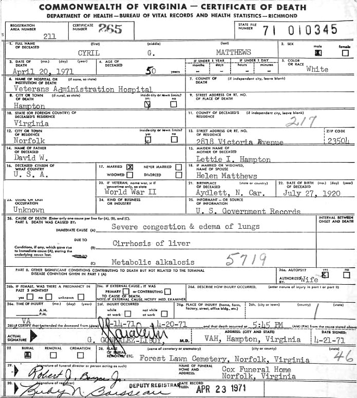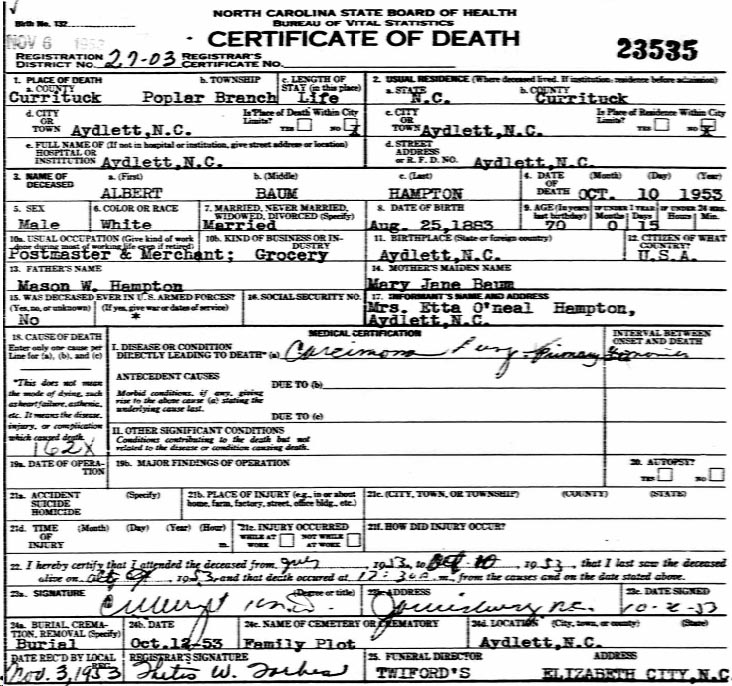 Albert "Al" Baum Hampton was born Aug. 25, 1883 to Mason Hampton & Mary Jane Baum. Al died in Aydlett on Oct. 10, 1953 [see death certificate]. He and his wife, Etta O'Neal Hampton, are buried in the Hampton-Doxey Cemetery in Aydlett. Albert became Postmaster of the Aydlett Post Office on June 28, 1909 and was listed in the census records as a grocery merchant. Cyril Glenn Matthews was born July 27, 1920 and died April 20, 1971 [see death certificate]. He was the son of David Wesley Matthews & his wife Lettie (Hampton) Matthews.Cyril is listed as a 1941 graduate of Dr. W,T. Griggs High School. When he signed his draft card in Feb. 1942 he was working in Norfolk at the Swift & Co. |
