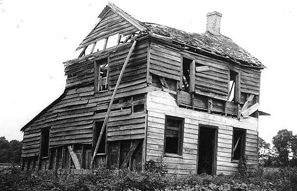 Located west of N.C. Highway 34 on road opposite the fork of Tulls Creek Road. Property of Tully Williams. Portions of old paneling may be seen where the siding has come away, and also portions of the plastering and lathes as well as some of the wooden pegs of the roof. |