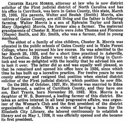 Biography of Chester Ralph Morris Source: North Carolina, The Old North State and the New by Archibald Henderson; Lewis Pub. Co., Chicago, Illinois.; © 1941; Vol. 4; pgs. 144-145