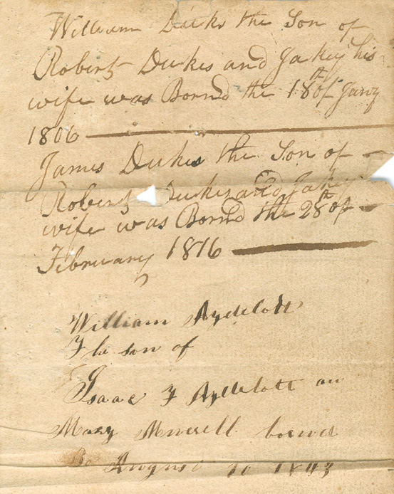![]() William Duks the Son of Robert Dukes and Jackey his wife was Bornd the 18th of Jany 1806 [NOTE: William Duke was living in the Powells Point Dist. in 1850] James Dukes the Son of Robert Dukes and Jackey [his] wife was Bornd the 28th of February 1816 William Aydelott the Son of Isaac T. Aydelott an Mary Murrell bornd August 10 1843 |