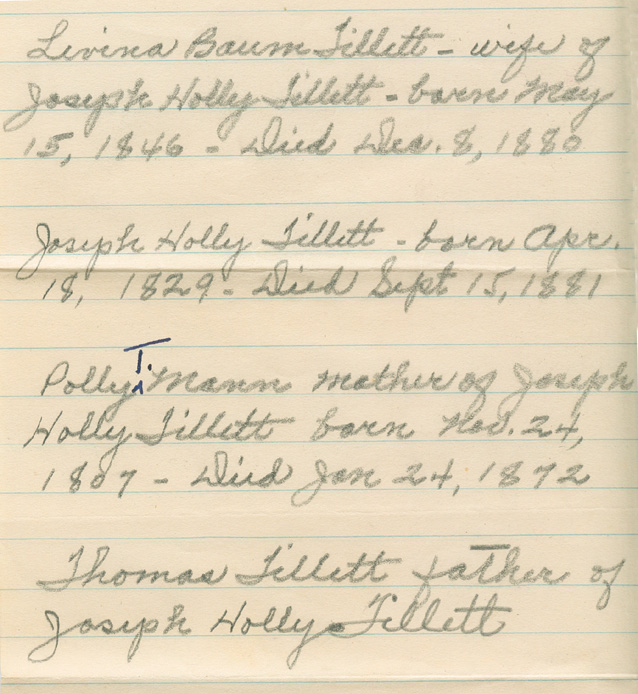 Levina Baum Tillett - wife of Joseph Holly Tillett - born May 15, 1846 - Died Dec. 8, 1880 Joseph Holly Tillett - born Apr. 18, 1829 - Died Sept. 15, 1881 Polly T. Mann mother of Joseph Holly Tillett born Nov. 24, 1807 - Died Jan. 24, 1872. Thomas Tillett father of Joseph Holly Tillett |