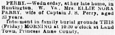 Martin Land in Princess Anne Co., VA on Sept. 18, 1884 and to them were born two children: Ellie Nora (Land) Perry was