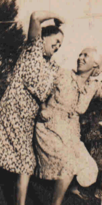Photo left: Bettie Gilden Garrenton right: Eva Blanche Morrisette Helms, clowning, pretending to be fighting, 1948. The Tony Field