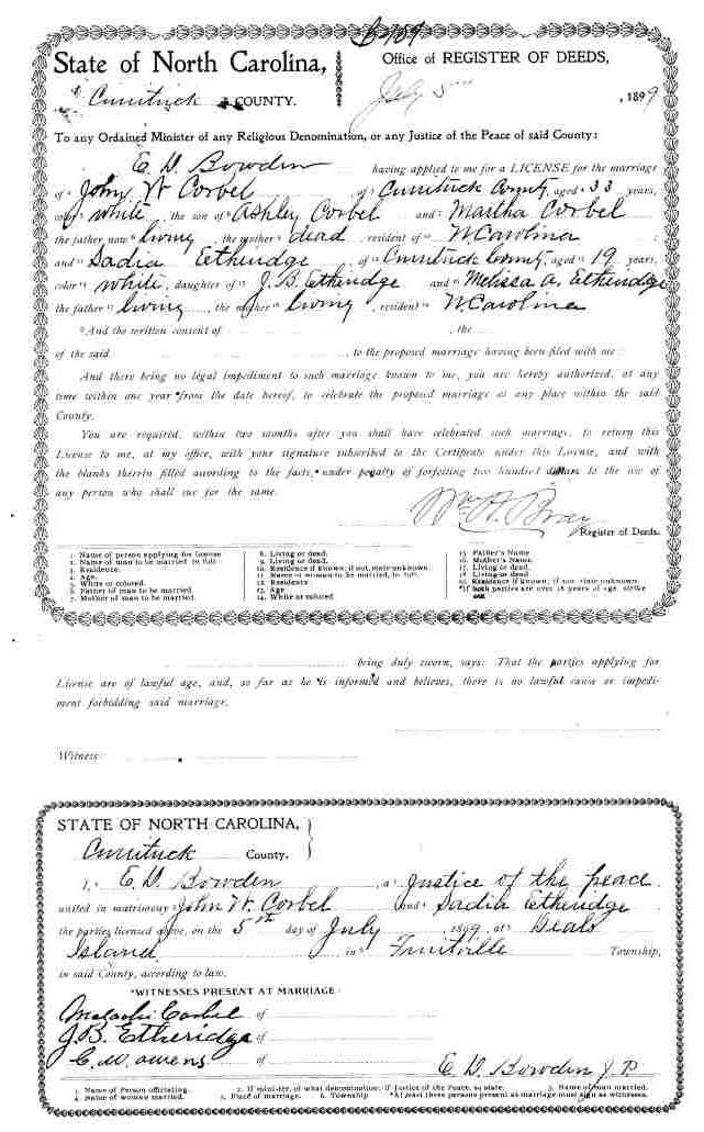 | Corbel, John W. | Ashley Corbel | Martha Corbel | Etheridge, Sadia | J.B. Etheridge | Melissa A. Etheridge | July 5, 1899 | E. D. Boiwden, J.P. |