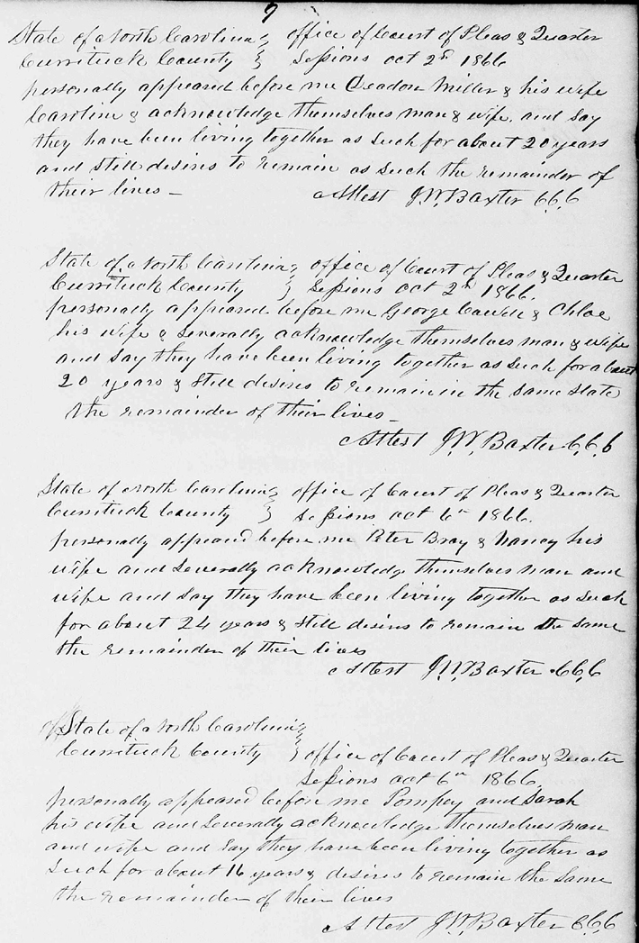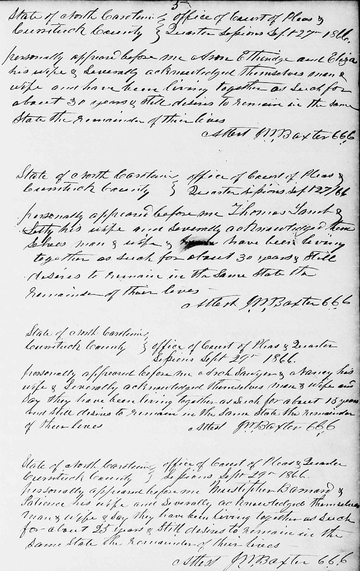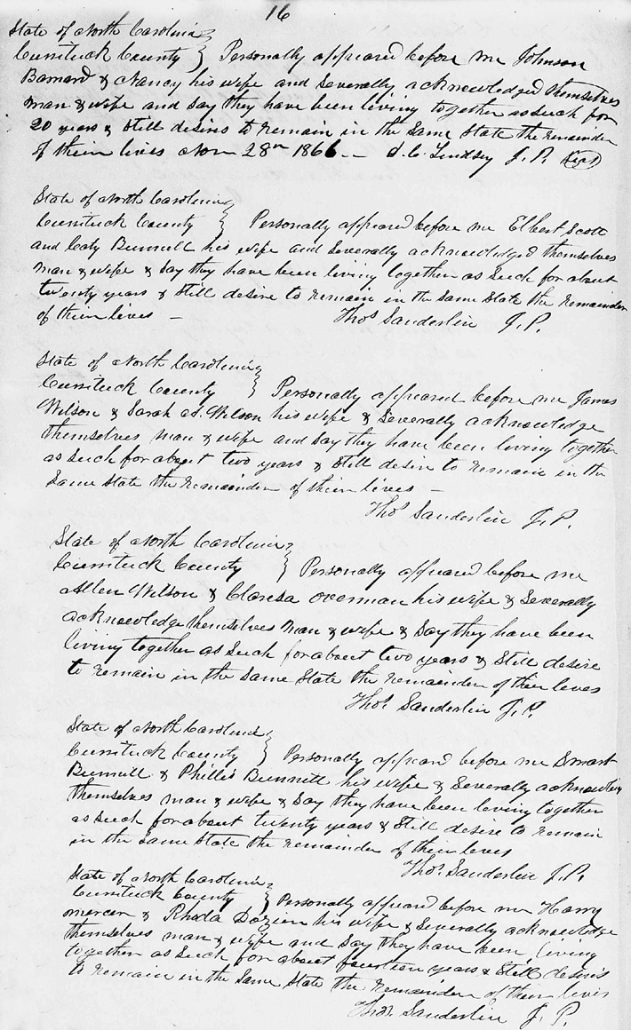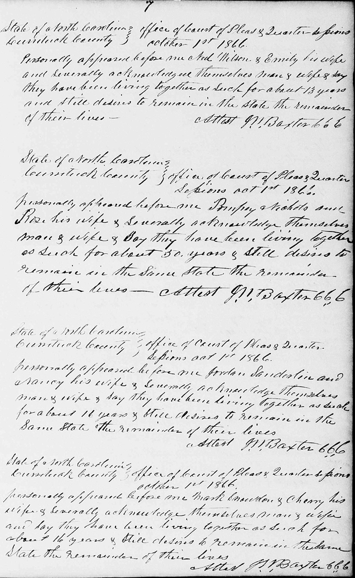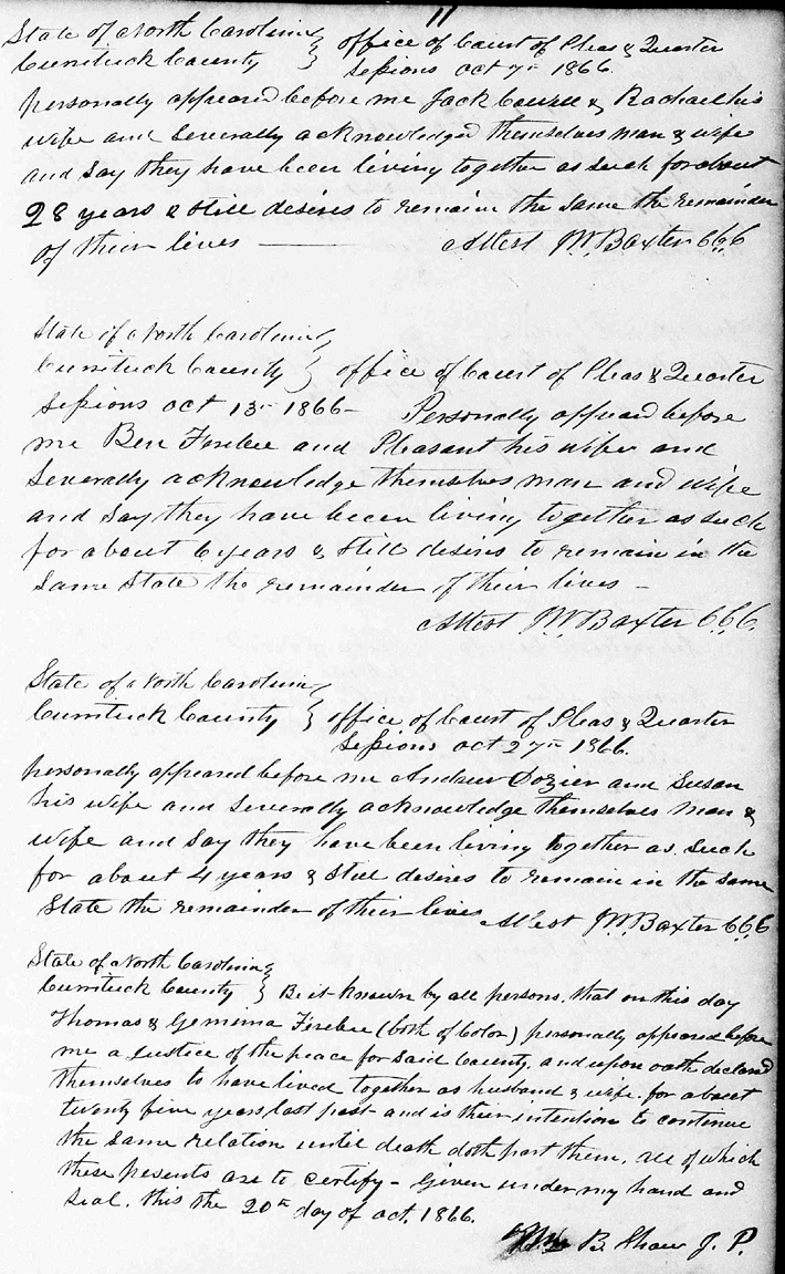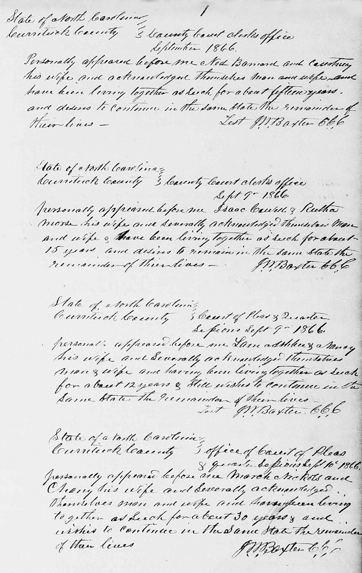 In North Carolina, the General Assembly in 1866 passed An Act Concerning Negroes and Persons of Color or of Mixed Blood. This Act contained 19 sections. Section 1 defined "persons of color". Section 5 decreed that those persons whose cohabitation was to be ratified into a state of marriage were required to appear before the local Clerk of County Court or Justice of the Peace to acknowledge that fact. Section 6 described the penalty for failure to do so before Sept. 1, 1866. Those acknowledgements were to be recorded and regarded as proof that a marriage had existed. Section 6 resulted in the vast majority of the couples reporting their marriages between March and September, 1866.