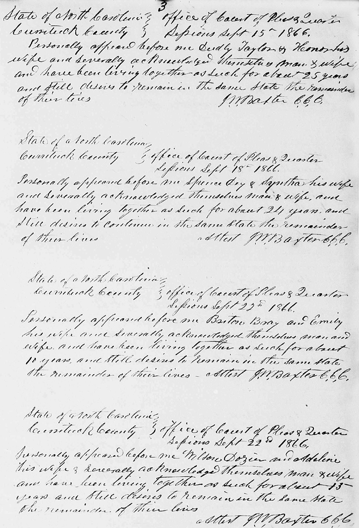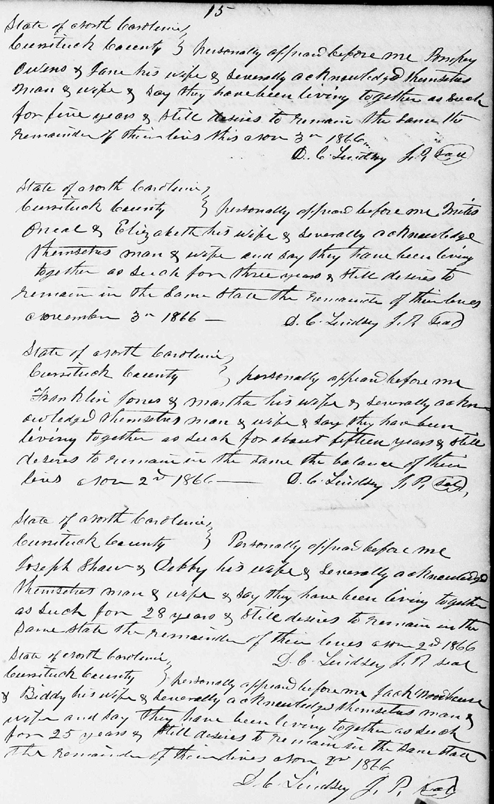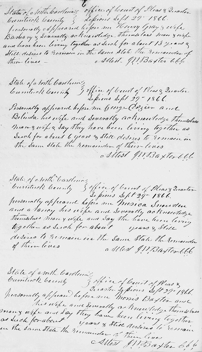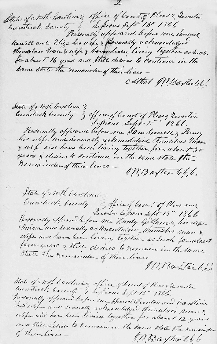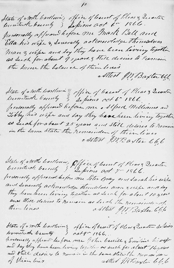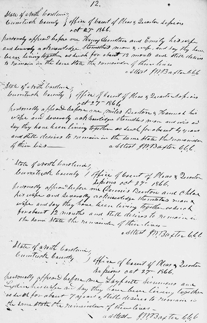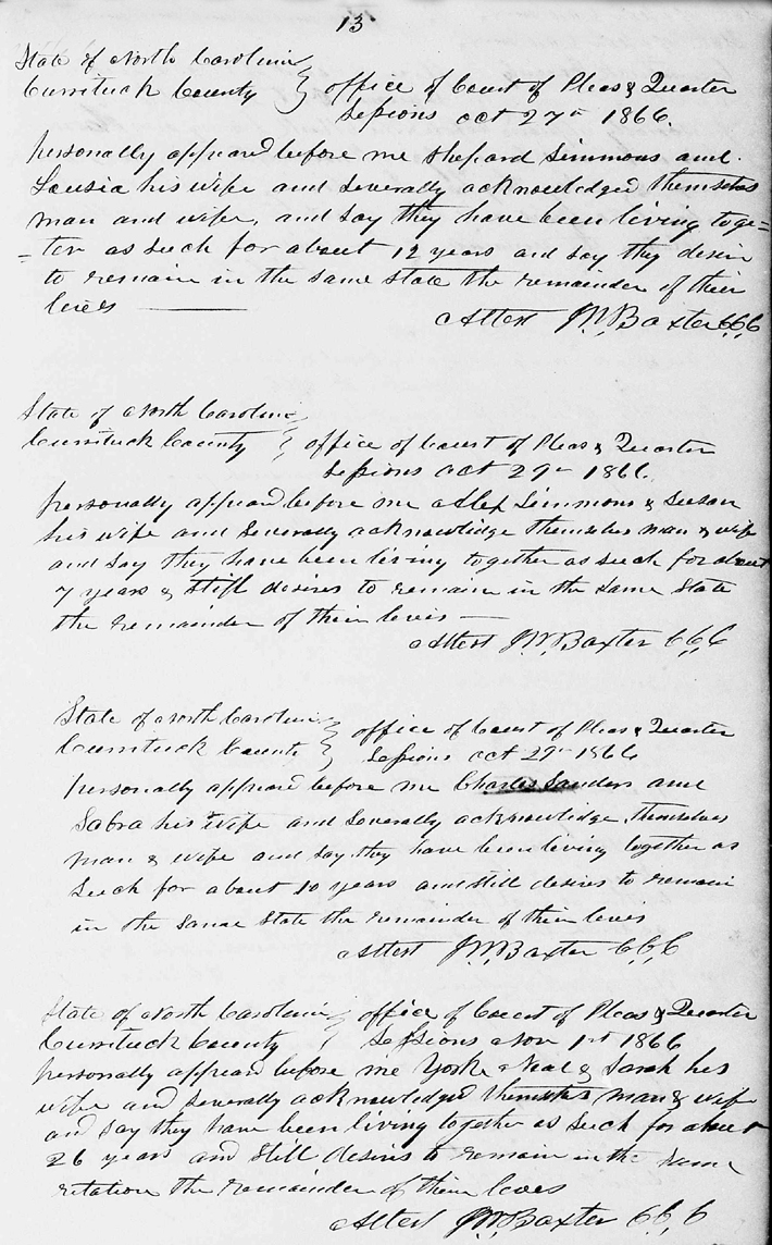 In North Carolina, the General Assembly in 1866 passed An Act Concerning Negroes and Persons of Color or of Mixed Blood. This Act contained 19 sections. Section 1 defined "persons of color". Section 5 decreed that those persons whose cohabitation was to be ratified into a state of marriage were required to appear before the local Clerk of County Court or Justice of the Peace to acknowledge that fact. Section 6 described the penalty for failure to do so before Sept. 1, 1866. Those acknowledgements were to be recorded and regarded as proof that a marriage had existed. Section 6 resulted in the vast majority of the couples reporting their marriages between March and September, 1866.