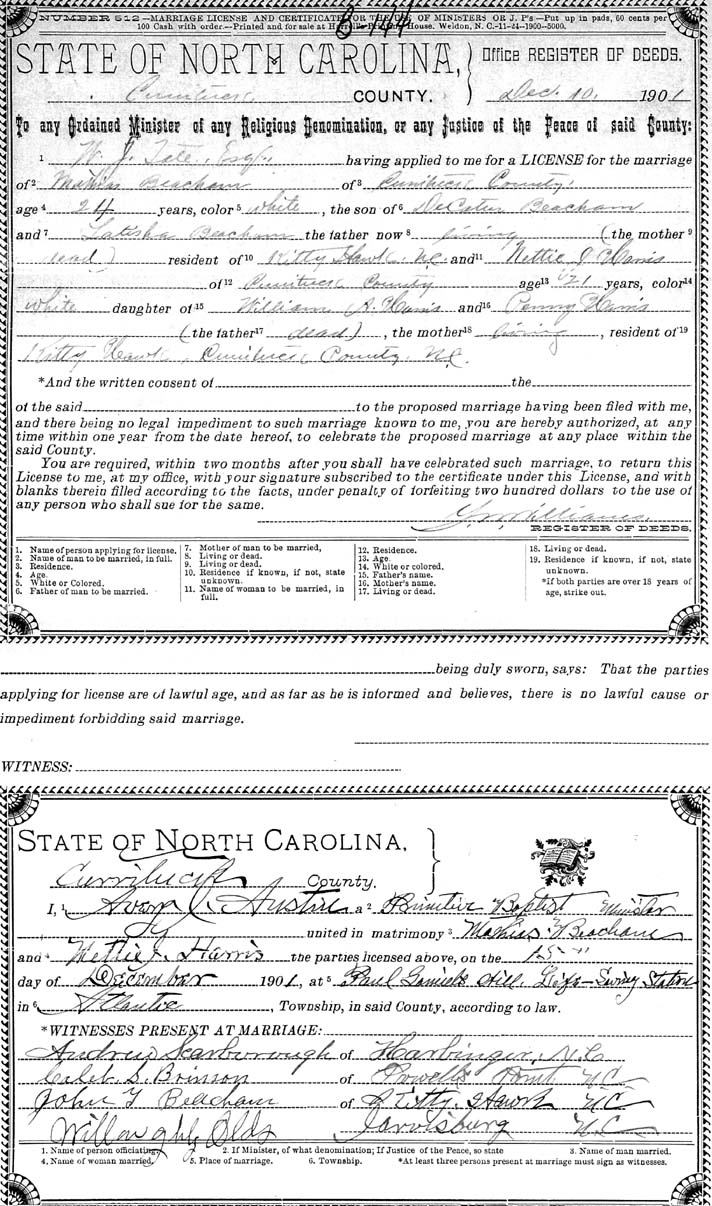 | Harris, Nettie J. | William A. Harris | Penny Harris | Beacham, Mathias | Decatur Beacham | Latisha Beacham | Dec. 15, 1901 | Avery J. Austin, Minister |