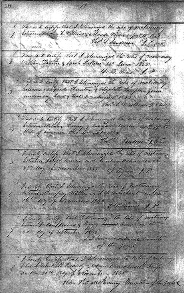 | Hampton, Elizabeth | Dunton, Elizabeth | Aug. 3, 1855 | Thos. L. Woodhous, J.P. | ||||