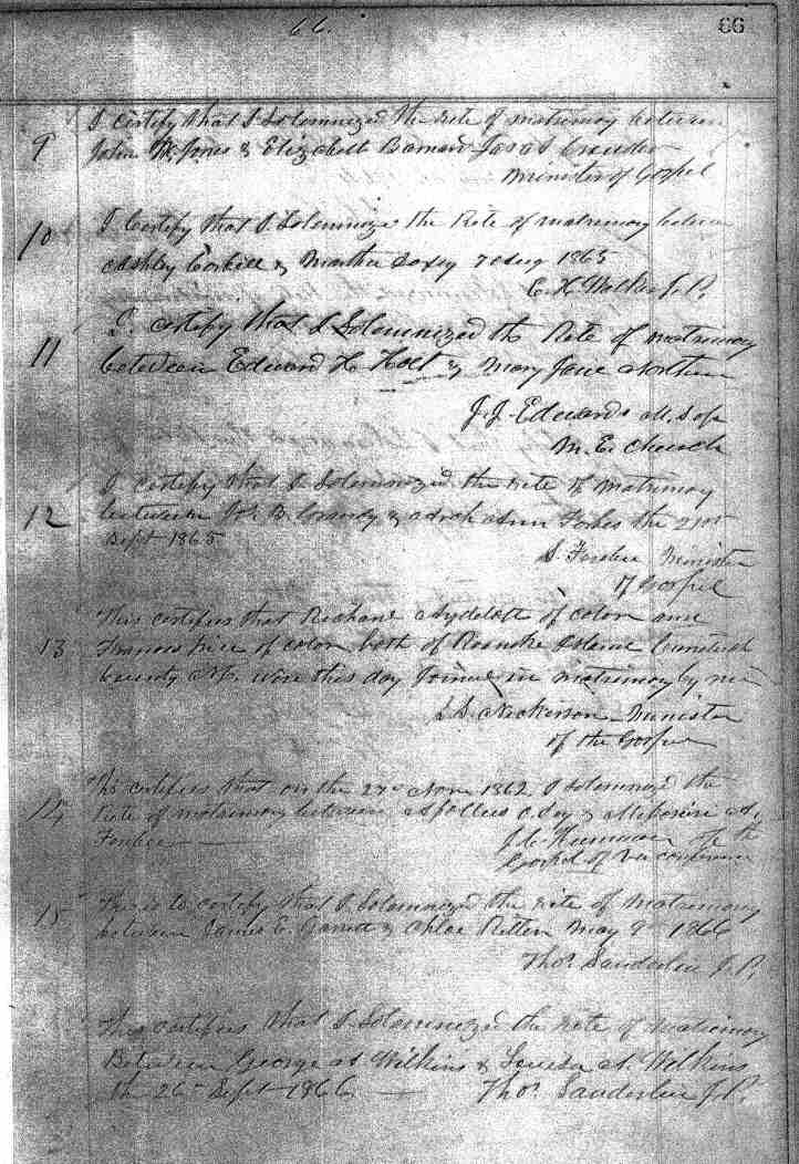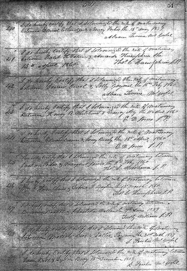 | Hampton, Malisia | Smith, Dempsey | Dec. 31, 1865 | Wm. S. Mercer J.P. | ||||