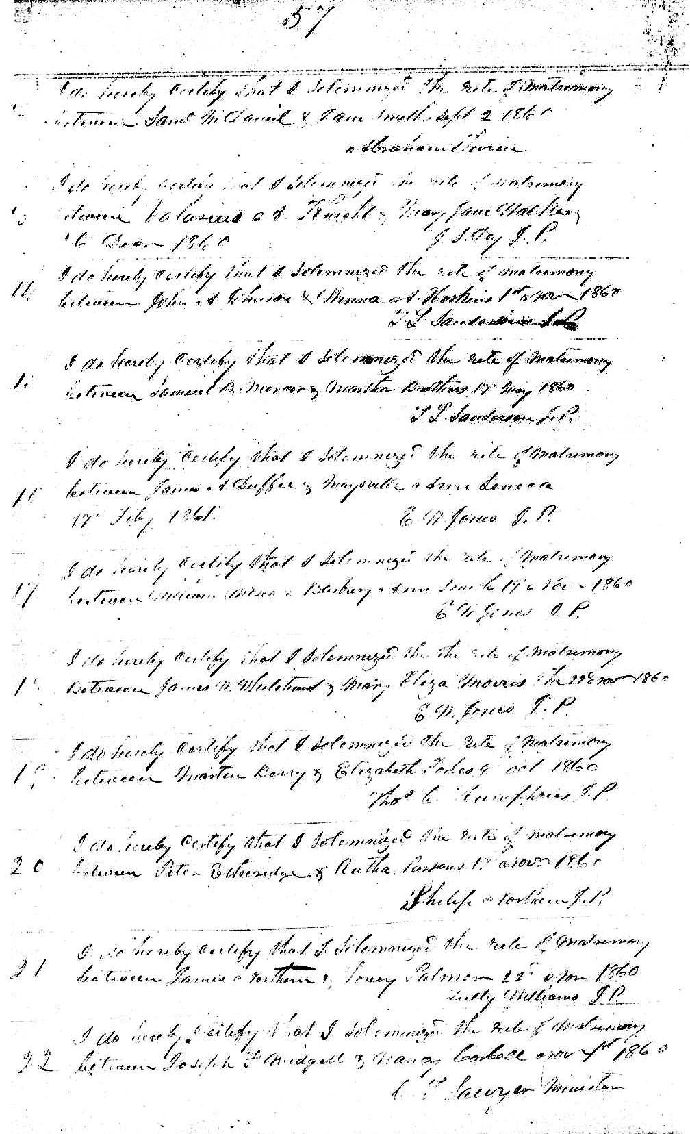 | Hoskins, Winna A. | Johnson, John A. | Nov. 1, 1860 | T.L. Sanderson, J.P. | ||||