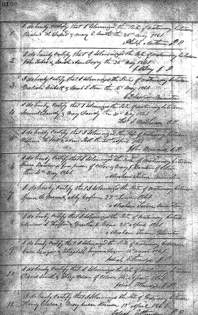 | Ivy, Nancy | Whitehurst, Henry R. | Apr. 11, 1860 | E.W. Jones. J.P. | ||||