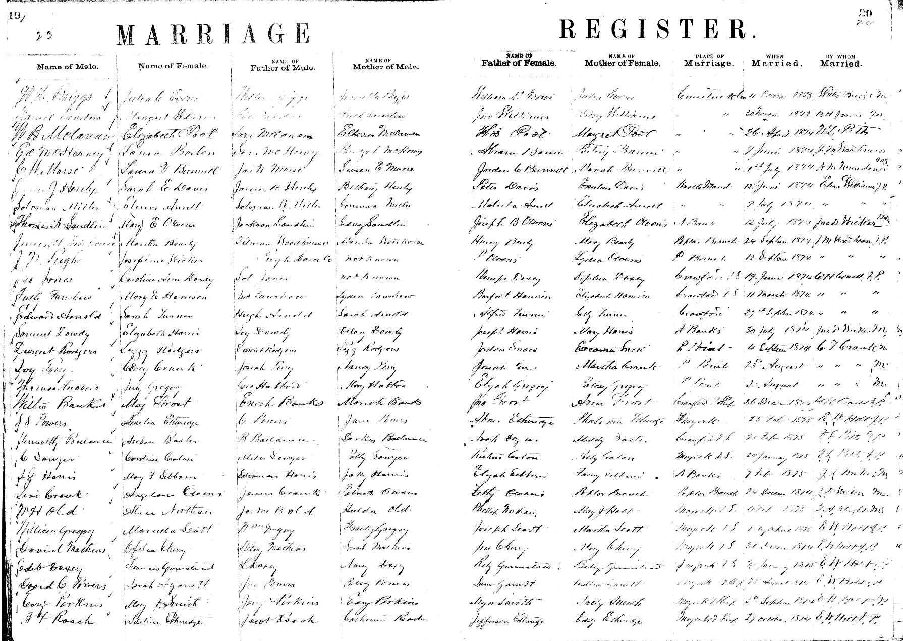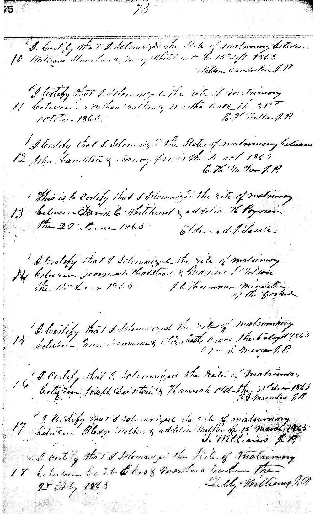 | Henley, James J. [also seen on pg. 19-20] | James B. Henley | Bethany Henley | Davis, Sarah E. | Peter Davis | Emeling Davis | June 12, 1874 | Elias Williams J.P. |