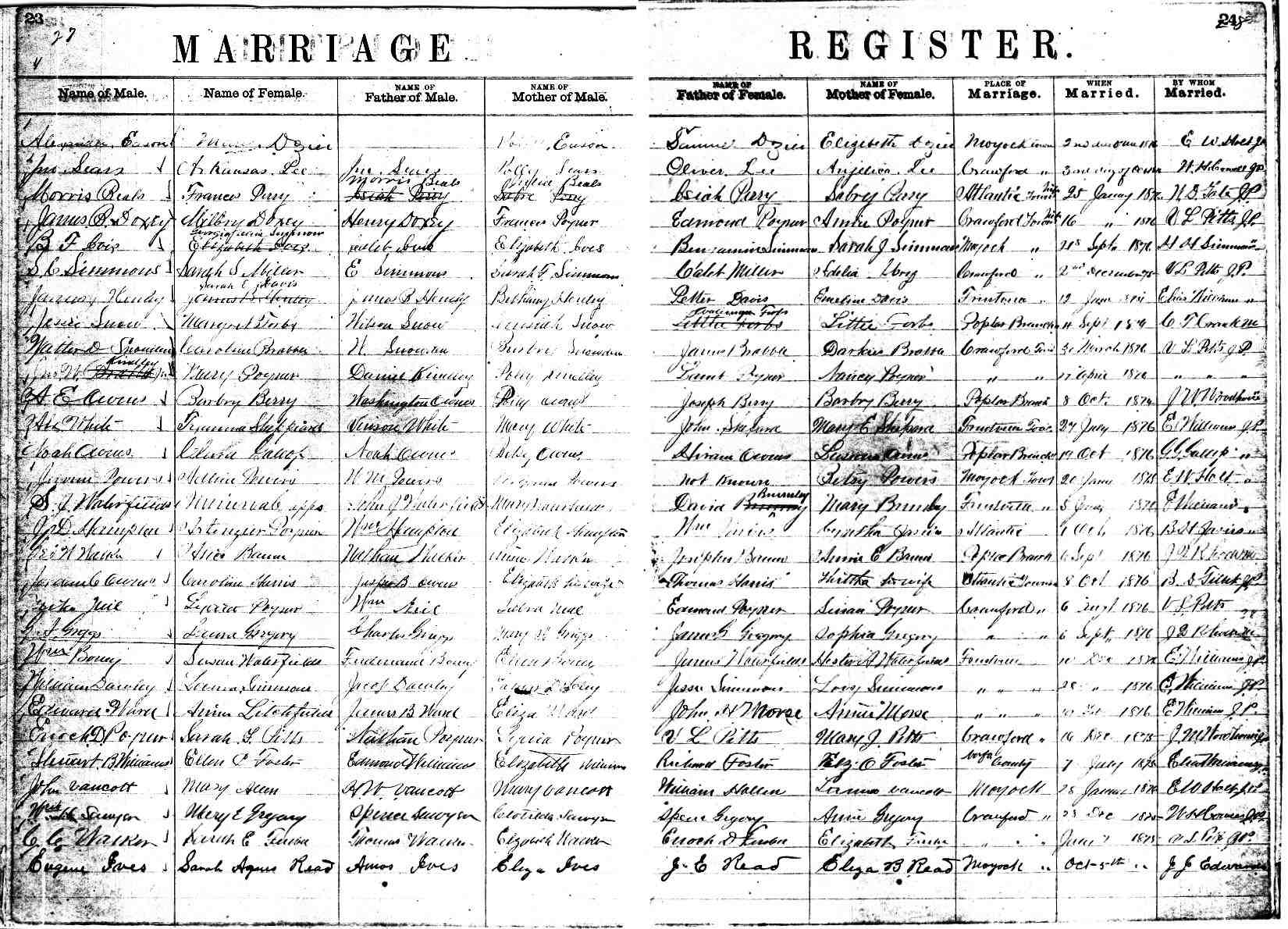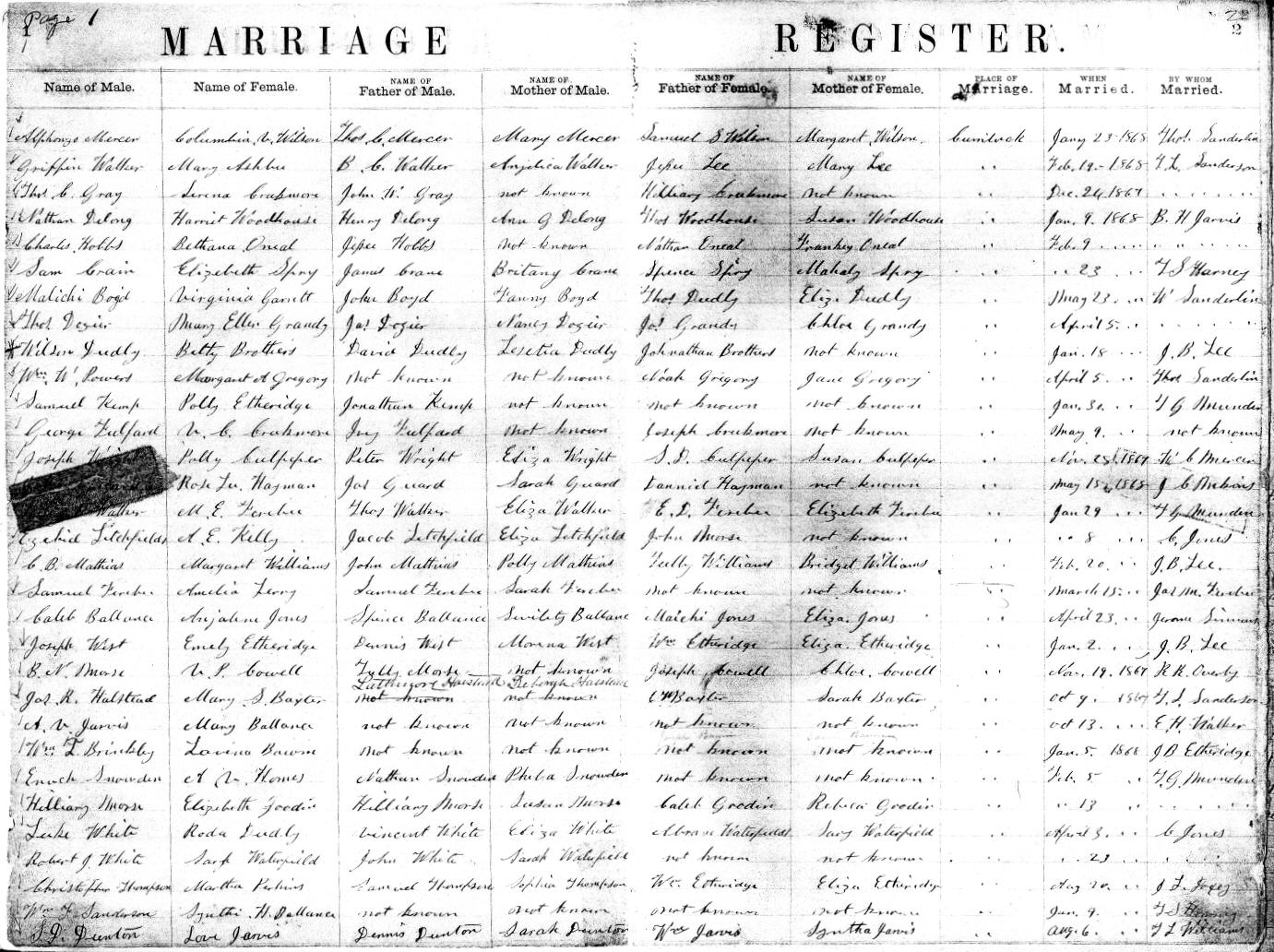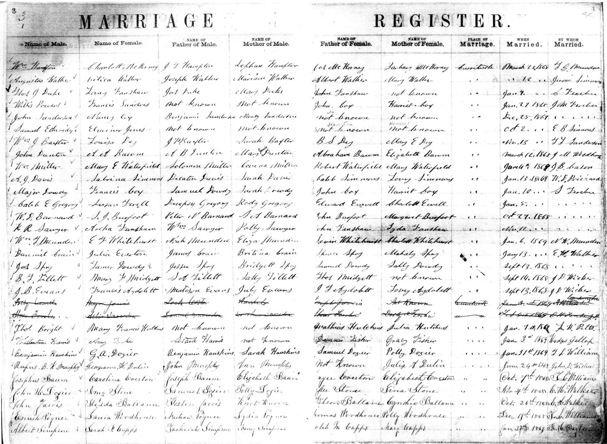 | Hayman, Rosa Lee | Daniel Hayman | not known | Guard, John | Jas. Guard | Sarah Guard | May 15, 1868 | I.C. Meekins |