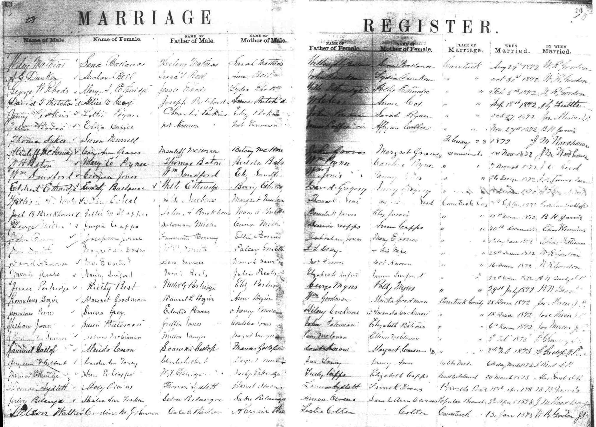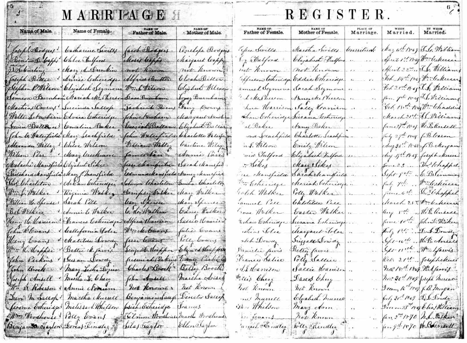 | Harrison, Heny H. | Alfred Harrison | Sallie Harrison | Etheridge, Frances | Nathan Etheridge | Lurana Etheridge | June 10, 1869 | John D. Wicker |