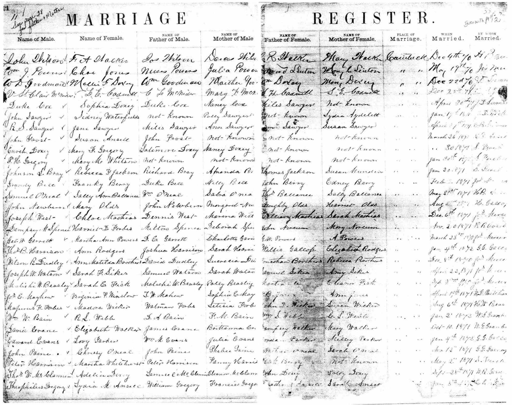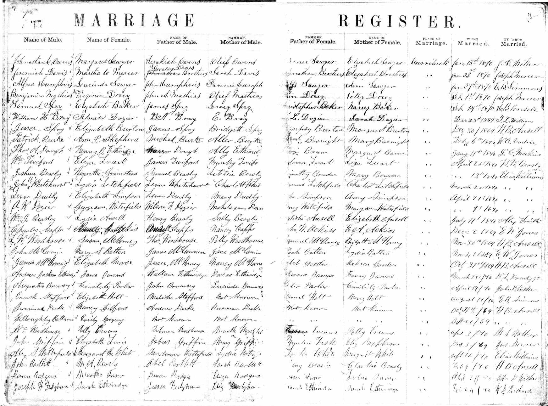 | Humphries, Alfred | John Humphries | Fannie Humphries | Sawyer, Lucinda | [?] Sawyer | Ann Sawyer | Jan. 27, 1870 | E.B. Simmons |