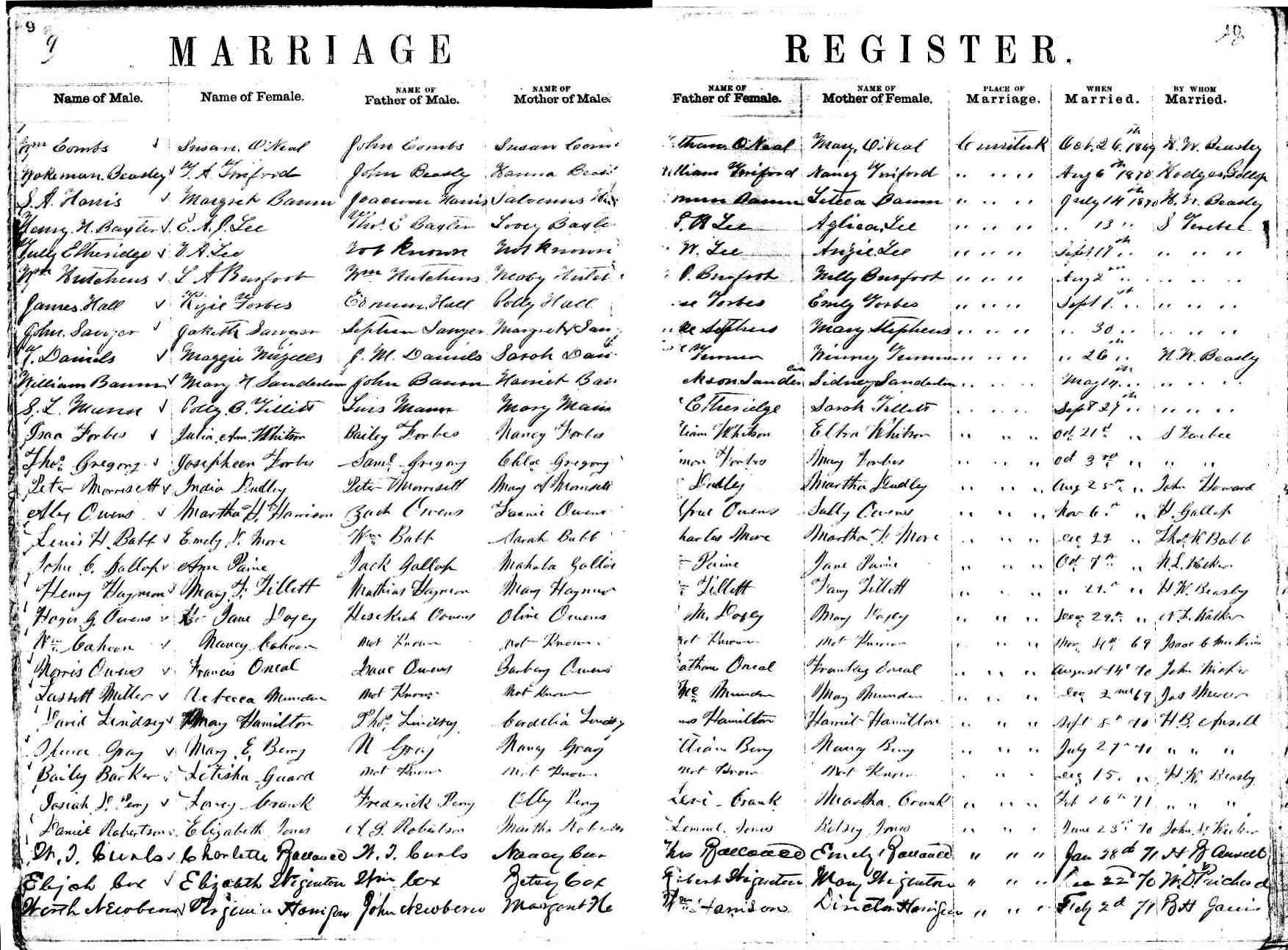 | Hobbs, Charles | Jesse Hobbs | not known | O'Neal, Bethana | Nathan O'Neal | Frankey O'Neal | Feb. 9, 1868 | B.H. Jarvis |