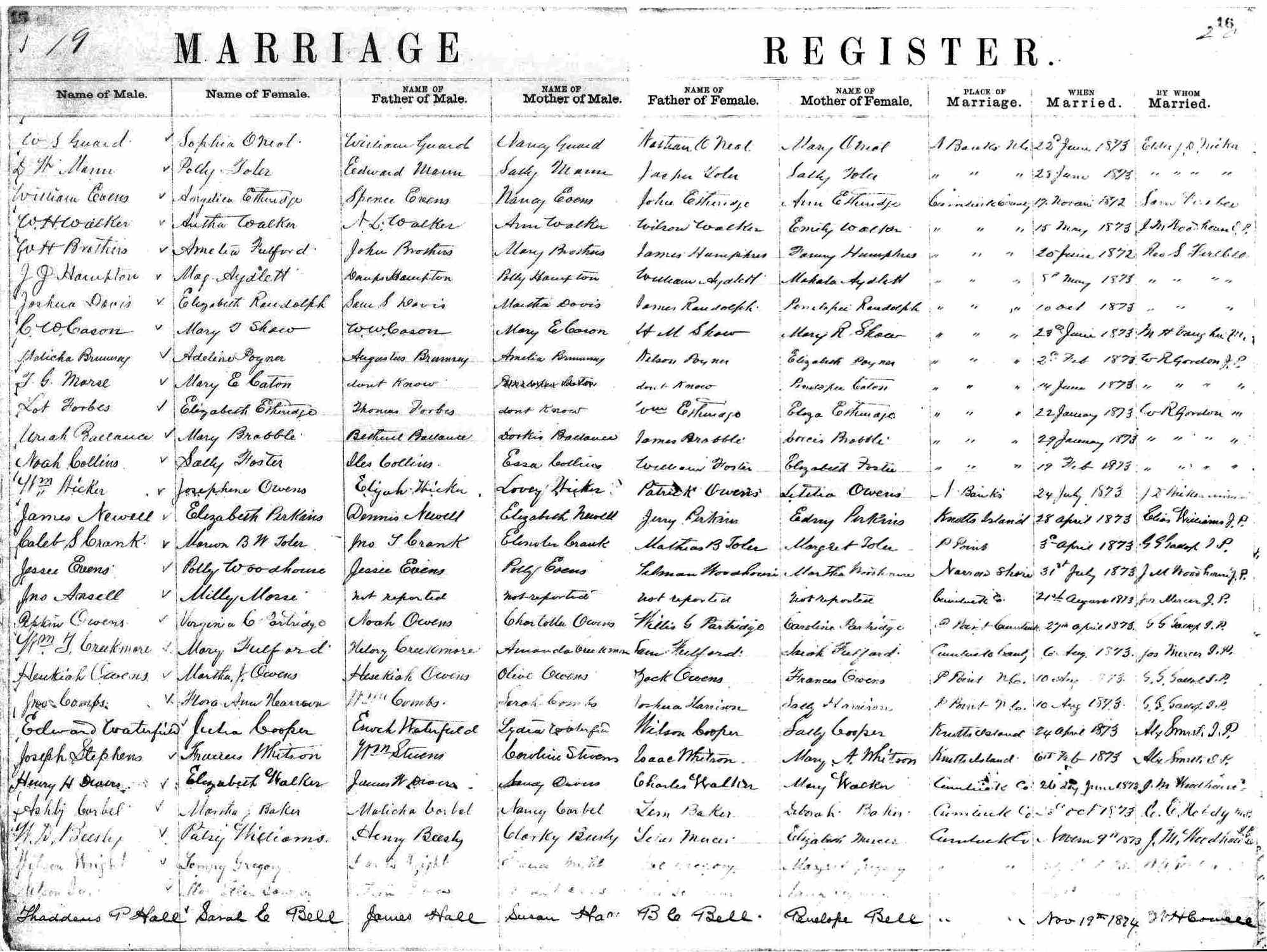 | Hampton, J.J. | Demps Hampton | Polly Hampton | Aydlett, Mag | William Aydlett | Mahala Aydlett | May 8, 1873 | Rev. S. Ferebee |