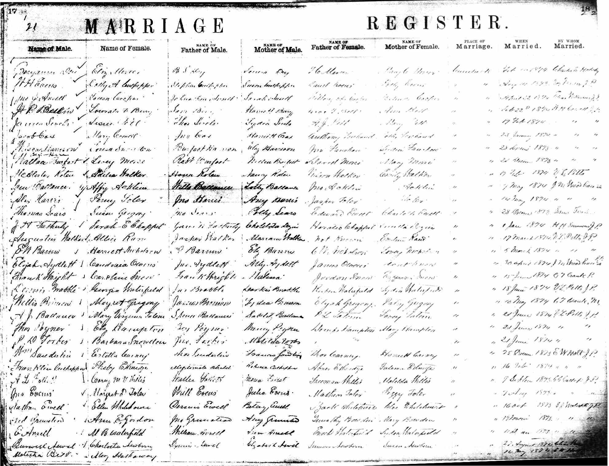 | Harrison, Mary E. | Burfoot Harrison | Elizabeth Harrison | Fanshaw, Tully | Jno. Fanshaw | Lydia Fanshaw | Mar. 11, 1874 | W.H. Cowell |