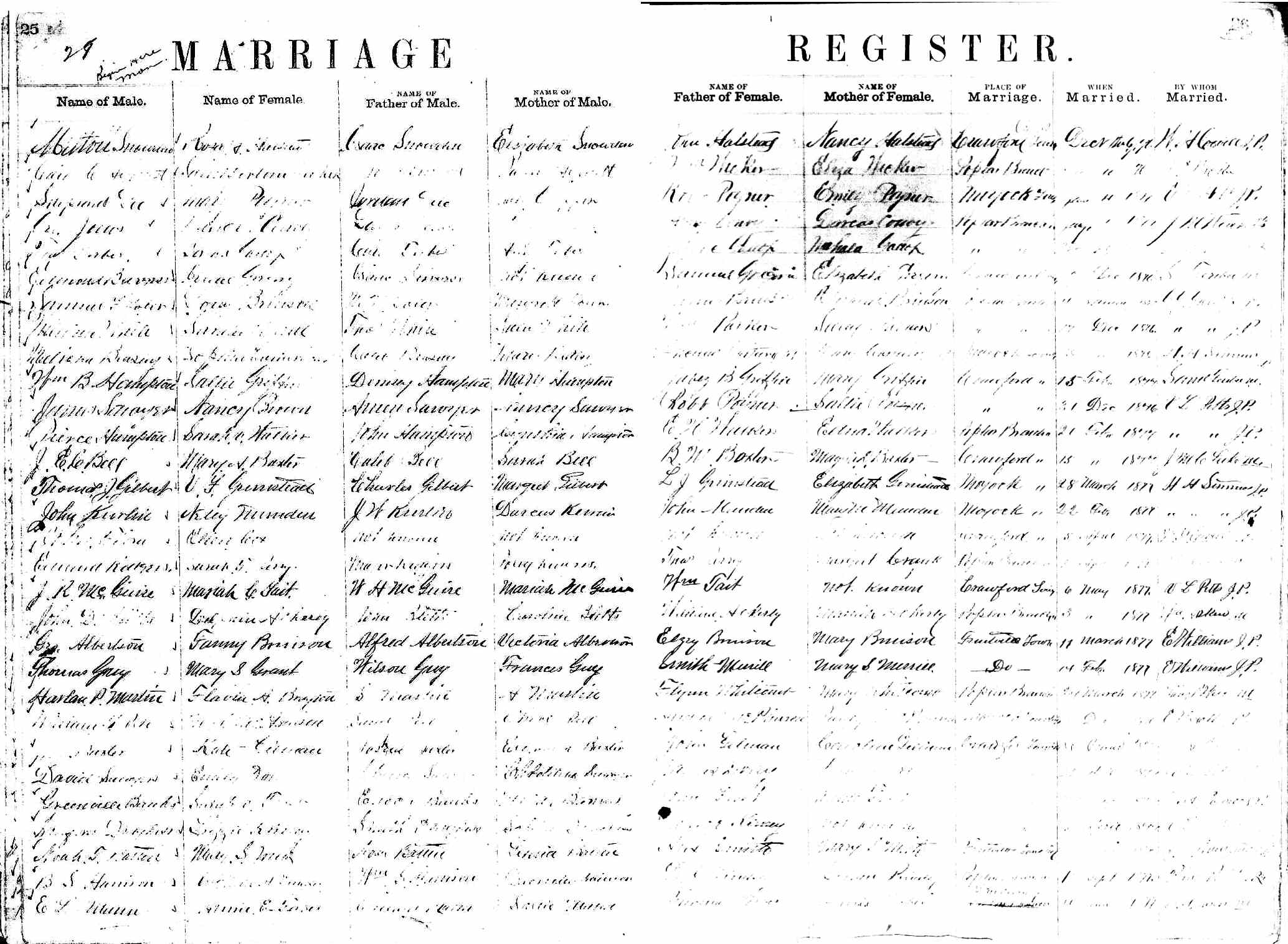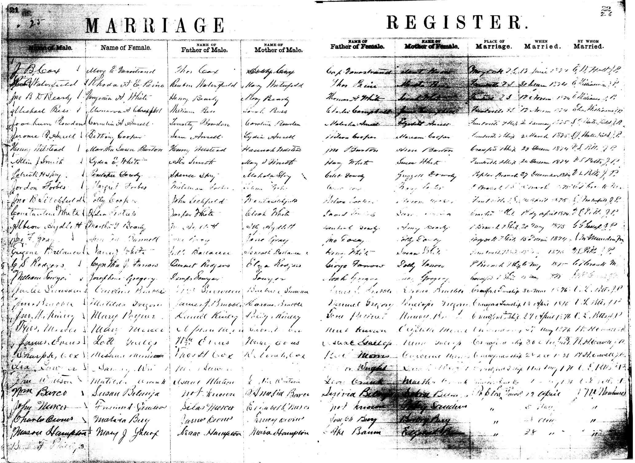 | Hampton, Pierce | John Hampton | Cynthia Hampton | Walker, Sarah V. | E.H. Walker | Edna Walker | Feb. 21, 1877 | V.L. Pitts |