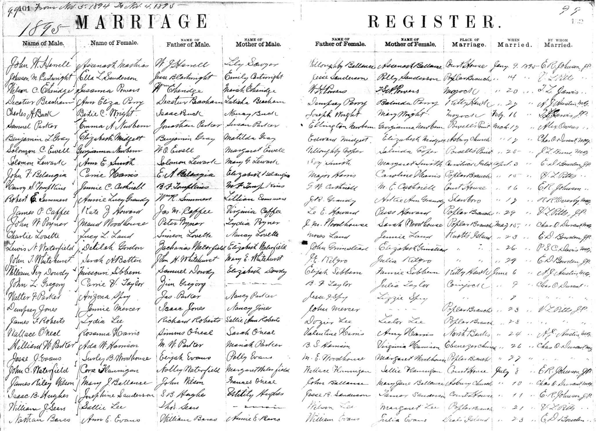 | Harrison, Ada W. | B.S. Harrison | Virginia Harrison | Parker, Hilliard W, | M.W. Parker | Mariah Parker | June 26, 1895 | Chas. O. Durant |