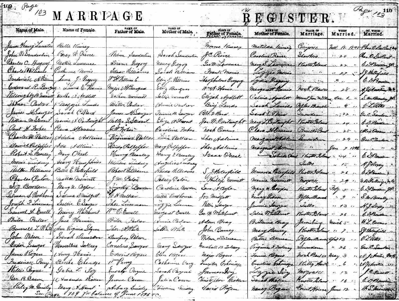 | Ivy, Gabie L. | James Ivy | Lizzie Ivy | Payne, Willis | Enoch Payne | Sarah Payne | May 13, 1896 | J. C. Ganett, M.G. |