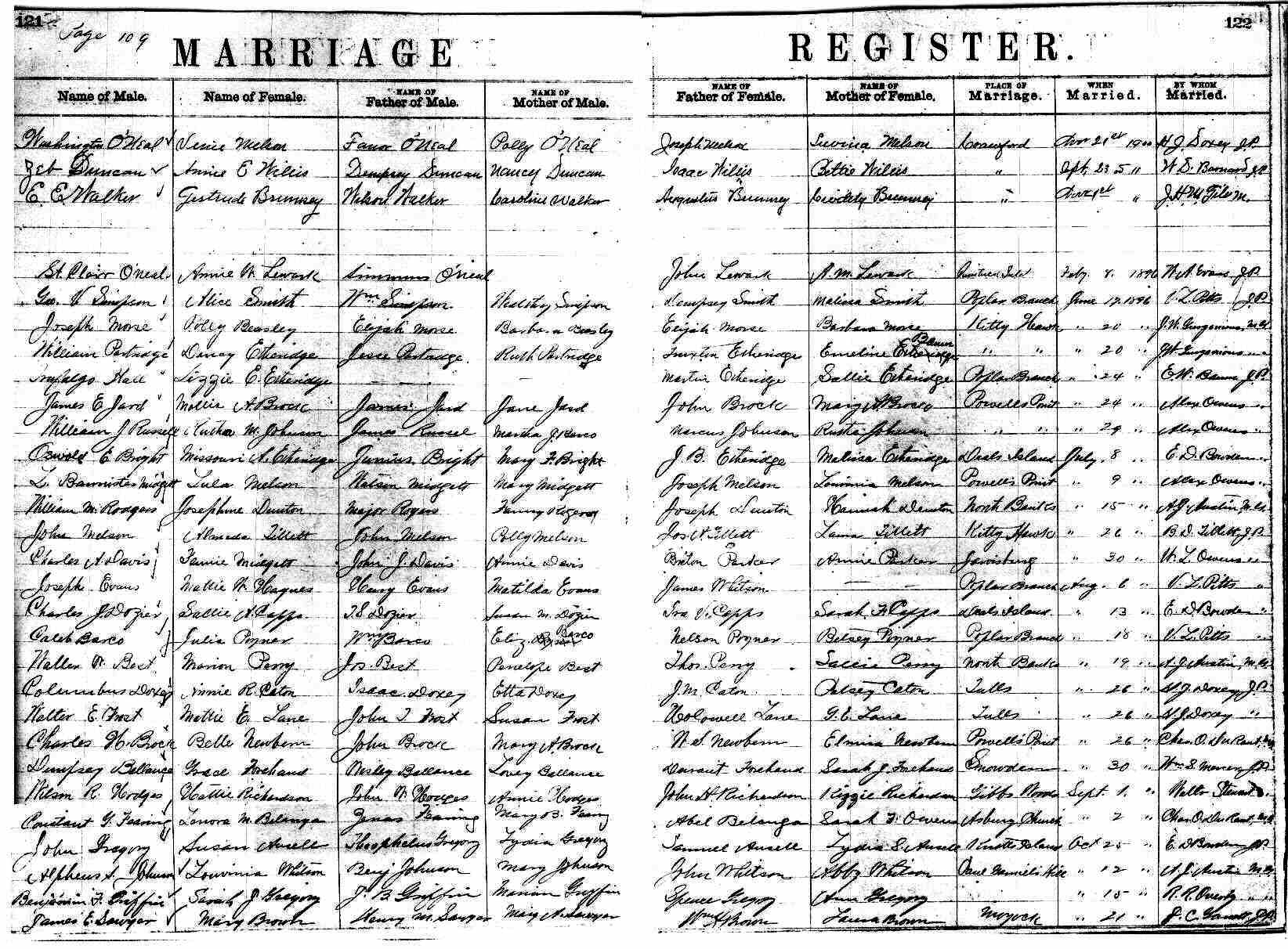 | Harrison, Jane | Adam Bray | Britania Bray | Parker, Briton | Briton Parker | Annie Parker | Mar. 5, 1896 | W. L. Owens, J.P. |