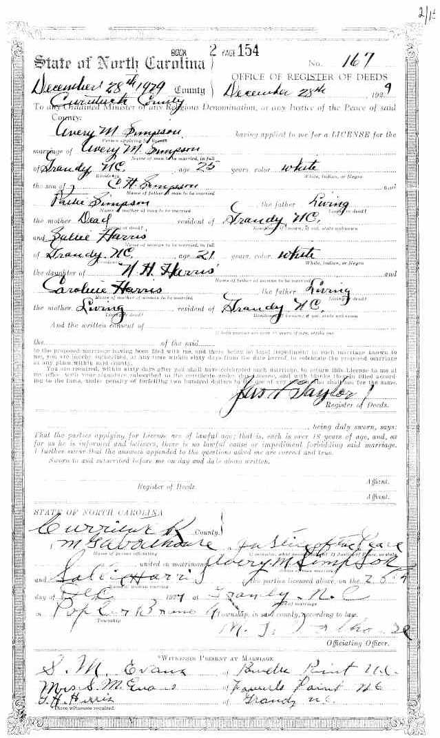 | Harris, Sallie | N.H. Harris | Caroline Harris | Simpson, Avery M. | C.H. Simpson | Pattie Simpson | Dec. 28, 1929 | M. G. Woodhouse, J.P. |