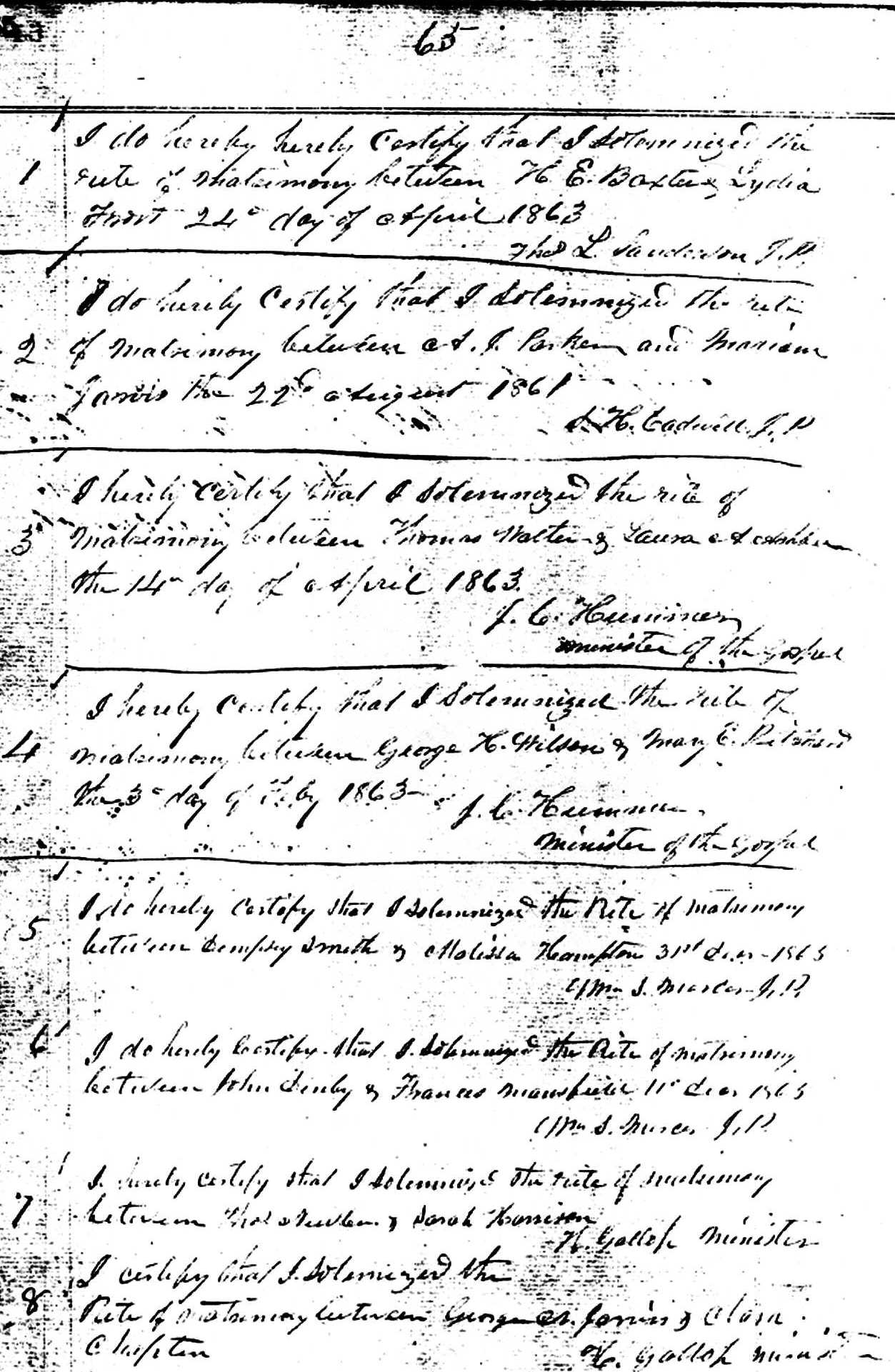 | pg. 65 H.E. BAXTER | Lydia FROST | 24 Apr 1863 [see listing here] |