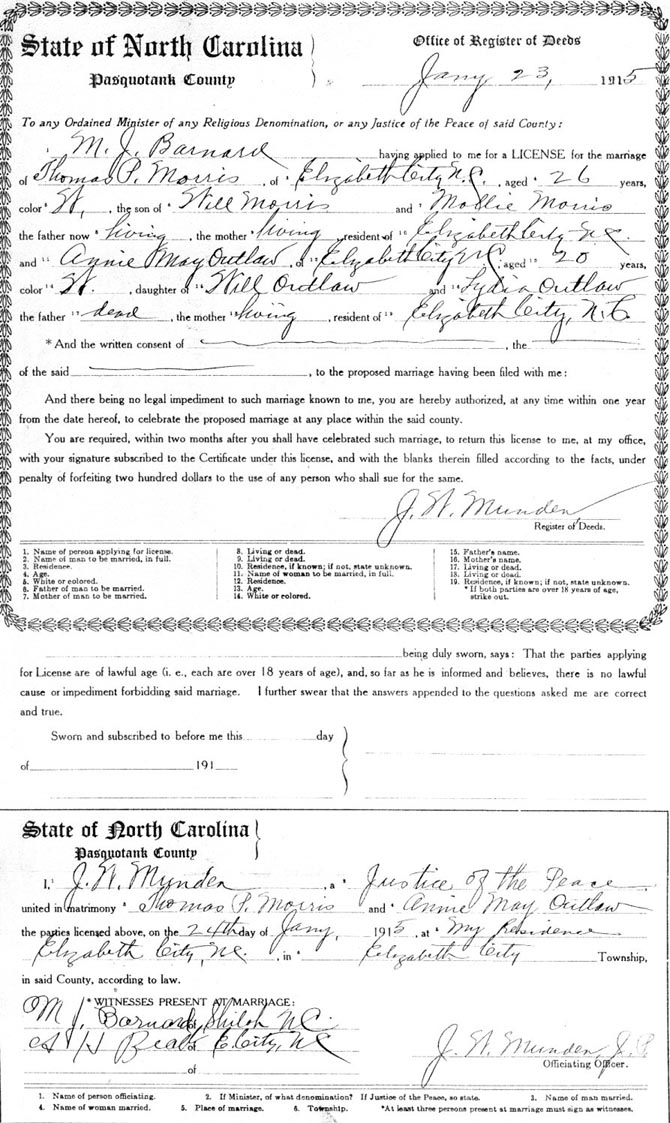 | Outlaw, Annie May | Will Outlaw | Lydia Outlaw | Morris, Thomas P. | Will Morris | Mollie Morris | Jan. 24, 1915 | J.W. Munden, J.P. |
