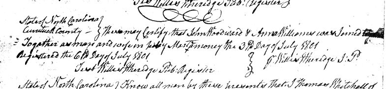 | Williams, Anna | Woodward, John | July 3, 1801 | Willis Etheridge, J.P. | ||||