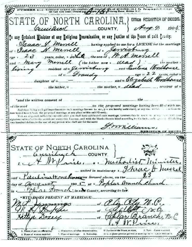 | Woodhouse, Tilman S. | W.H, Walker | Bettie Woodhouse | Midgett, Salma D. | Jos. Midgett | Nancy Gibson | Feb. 9, 1896 | S. M. Beasley, J.P. |