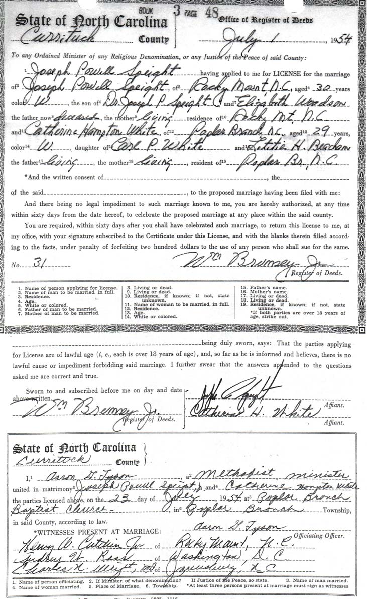 | White, Catherine Hampton | Carl P. White | Letitia H. Beacham | Speight, Joseph Powell Jr. | Dr. Joseph P. Speight | Elizabeth Woodson | July 23, 1954 | Aaron G. Tyson, Minister |