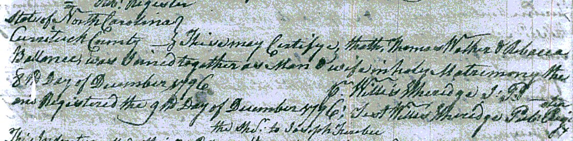 | Walker, Thomas | Ballance, Rebecca | Dec. 8, 1796 | Willis Etheridge, J.P. | ||||