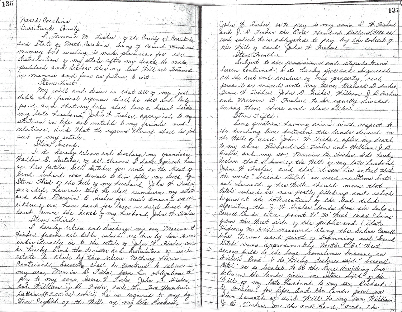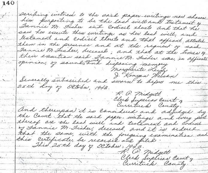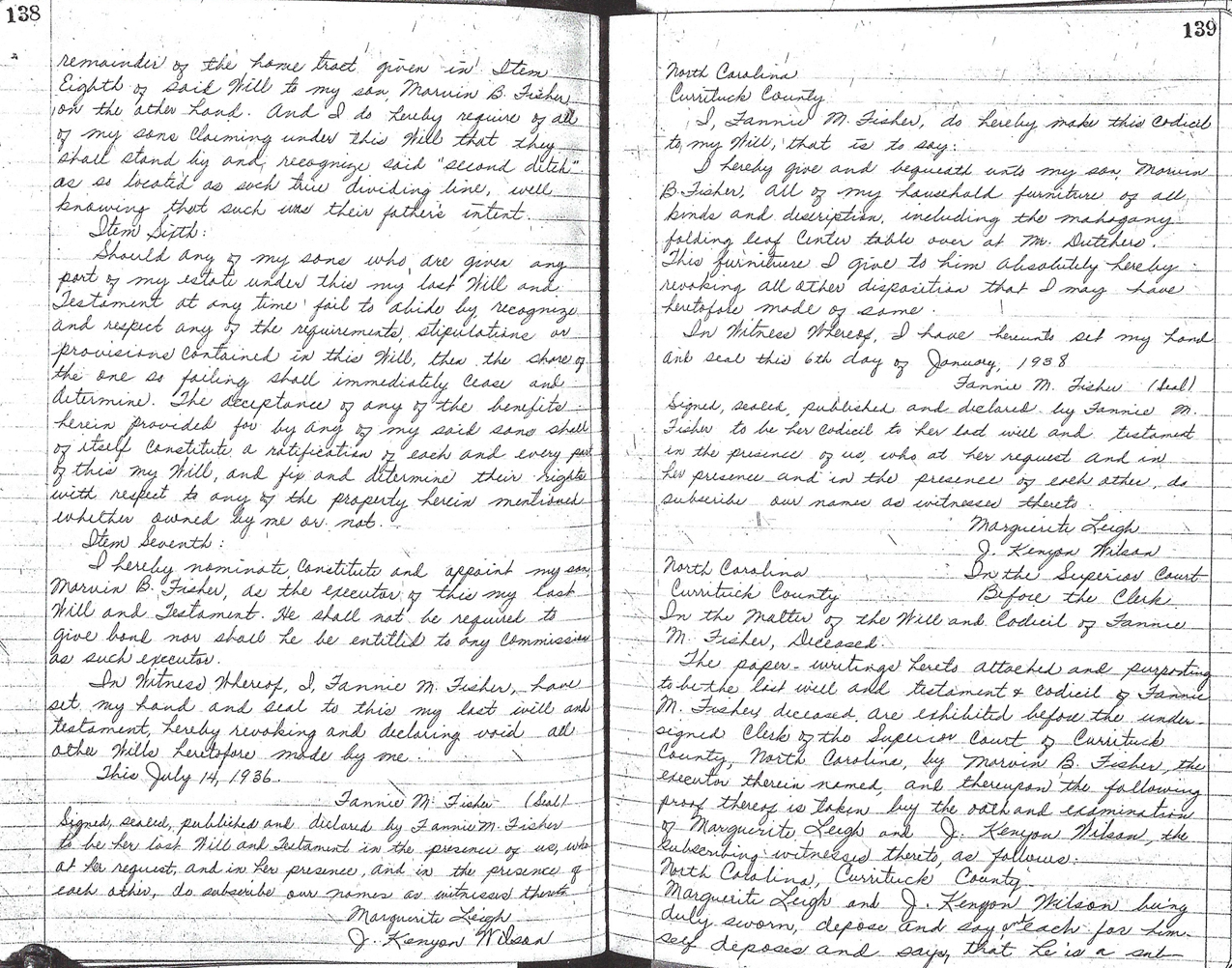 Fannie Melson Fisher July 14, 1936 - Codicil: Jan. 6, 1938Probate: Oct. 25, 1943 Currituck Co. Will Book 7-8; pgs. 136-140