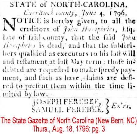 I nominate and appoint my son John HUMPHRIES, Thomas Cooper FEREBEE, Joseph FEREBEE, Samuel FEREBEE, and William NEAVIL my lawfull executors to act and settle my business, given under my hand and seal this 19th day of December 1795.