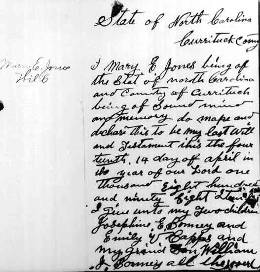 Mary E. JONES Will State of North Carolina I Mary E. JONES being of the Stat of north Carolina and County of Currituck being of Sound mind and memory do make and declare this to be my last Will and Testament this the fourteenth 14 day of April in the year of our Lord one thousand eight hundred and ninety eight. Item first I give unto my two children Josephine E. BONNEY and Emily V. CAPPS and my grand son William J. BONNEY all the (over) |